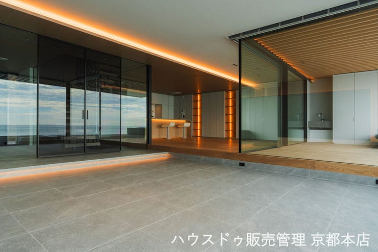 一番の魅力は、雄大な相模湾を一望できる約50畳(165㎡超)の広大なLDKと、水平線に繋がるようなウッドデッキテラス 。