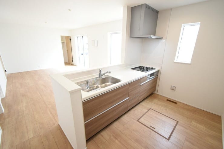 リビングを見渡せる対面式キッチンには床下収納も♪
