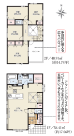 | 備考 | ■閑静な住宅街 ■吹抜のある明るく開放的な空間 ■LDK20.5帖+マルチスキップ2.5帖人気の間取り ■雨の日に便利な室内物干付き ■カースペース2台分あり(車種による) ※ゴミ置き場持分:4.60㎡×1/10あり |