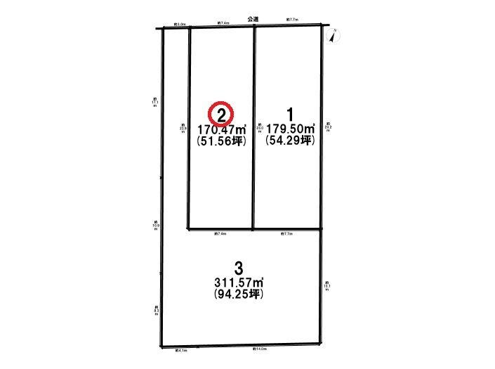 | 土地面積 | 170.47㎡(51.56坪) | 接道 | 北側(公道)幅 約5.4m 間口 約7.41m |