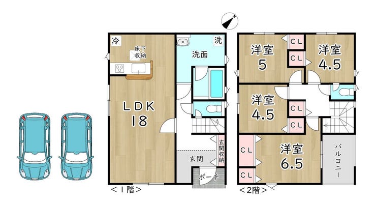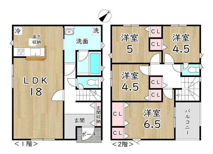 4LDKのゆとりある間取りです。2階の洋室は子供部屋や書斎などにお使いいただけます。人気の対面式キッチンでお子様を見守りながら料理ができます。全居室収納があり、たっぷり収納できます。また、キッチンから洗面室に行くことができ水回りの動線がスムーズです。お気軽にご相談ください♪