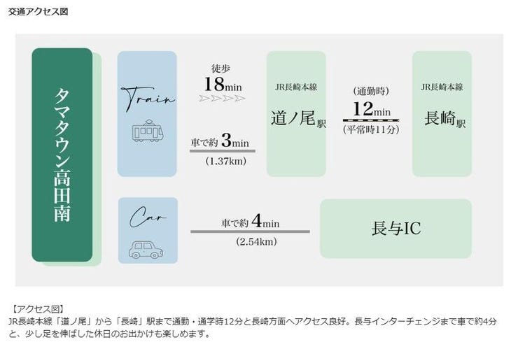 | 周辺環境 | 道ノ尾保育園 徒歩20分 (約1560m) OKホーム&ガーデン 長与店 徒歩13分 (約980m) セブンイレブン長崎道ノ尾店 徒歩16分 (約1280m) 長与 高田小学校 徒歩25分 (約1980m) 長与 高田中学校 徒歩25分 (約1980m) |