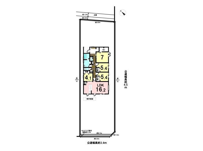| 土地面積 | 公330㎡(99.82坪) | 接道 | 南東側(公道)幅 約4.5m 間口 約33.34m 南西側(公道)幅 約3.4m 間口 約8.46m |