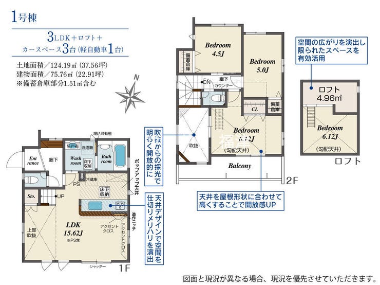 | 建物面積 | 75.76㎡ | 駐車場 | あり 普通:2台 軽:1台 |