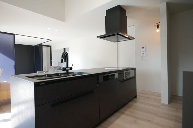 システムキッチンには食洗器も完備されており、家事の負担を軽減。ダウンライトが施された明るい空間は落ち着いた雰囲気を演出します。