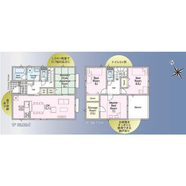 室内は、季節物の保管に便利な2.5帖の納戸を完備するなど、収納力の高さが魅力