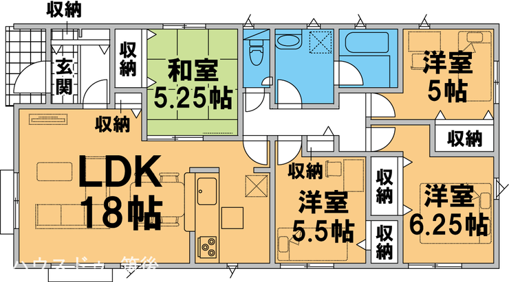 LDK18帖の広さを確保し、各居室を無理なく配置した平屋4LDK。和室は客間やくつろぎスペースとしても活用でき、家族構成の変化にも柔軟に対応します。ワンフロアで生活が完結するため、日々の移動や家事負担を軽減。将来も安心して長く住み続けられる、実用性の高い住まいです。