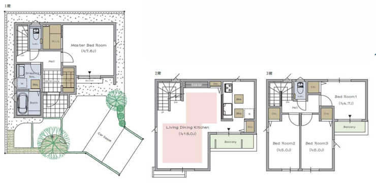| 備考 | 3階建てのゆとりある間取りプラン。2階に約18帖のLDKを配置し、家族が集まりやすい開放的な空間を実現しています。対面式キッチン・食洗機付きで家事効率も良好。 1階には主寝室と水回りを集約し、生活動線に配慮。洗面室・浴室・トイレは窓付きで換気もしやすい設計です。各居室に収納を確保し、3階にはバルコニーも設置。 カースペース付き。周辺は落ち着いた住環境で、毎日の暮らしを快適にサポートする住まいです。詳細はお気軽にお問い合わせください。 |