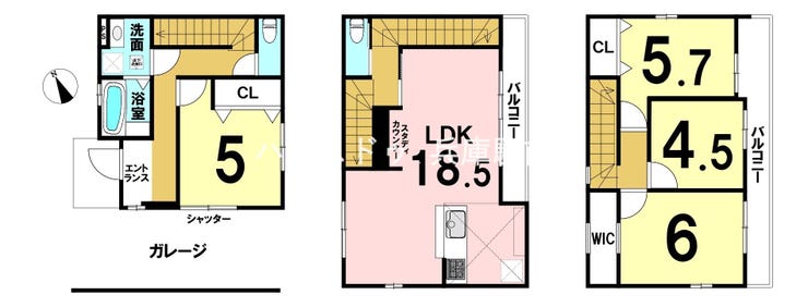 木造3階建て、間取りは4LDKで、LDKは約18.5帖の広さを確保。