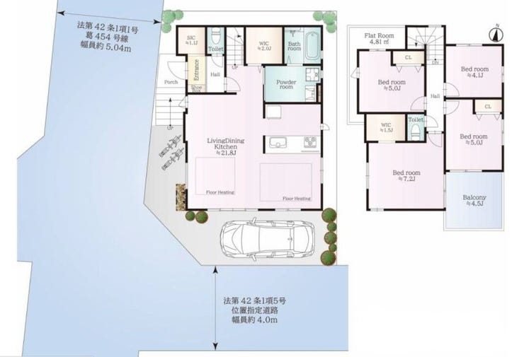 | 土地面積 | 実102.97㎡(31.14坪) | 接道 | 南側(私道)幅 約4.0m 西側(公道)幅 約5.0m |