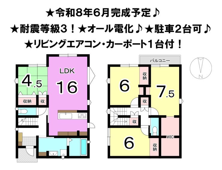 ■令和8年6月完成予定 ■駐車2台可 ■耐震等級3 ■リビングエアコン・カーポート付