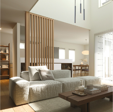 LDKは贅沢な22帖。リビング上部には大きな吹き抜けがあり、家族がどこにいても繋がりを感じられる、明るく開放的な住空間を実現しました。