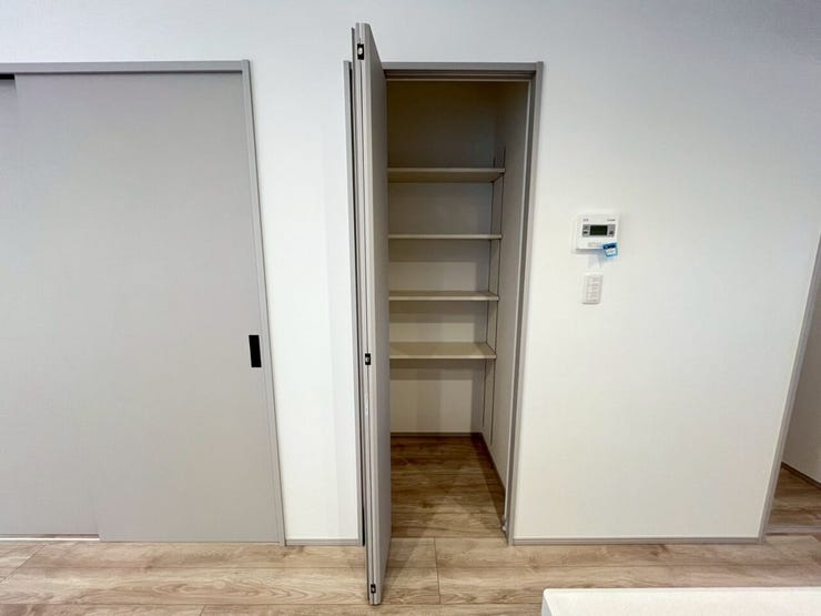 室内は各居室に加え、キッチン周りにも収納を豊富に確保しており、日用品や食材のストックもすっきり整理可能。