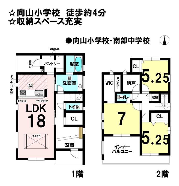| 小学区 | 向山小学校 徒歩4分 (約300m) | 中学区 | 南部中学校 徒歩24分 (約1900m) |