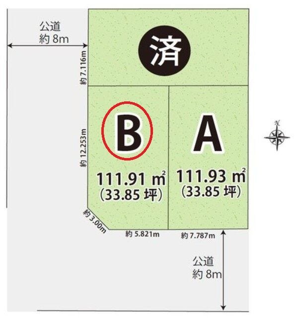 | 土地面積 | 111.91㎡(33.85坪) | 接道 | 南側(公道)幅 約8.0m 西側(公道)幅 約8.0m |