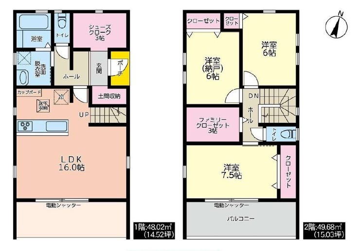 | 備考 | □カースペース3~4台可(車種による) □南面シャッター1階、2階電動シャッター付き □シューズクローク、ファミリークローゼットあり収納充実 |