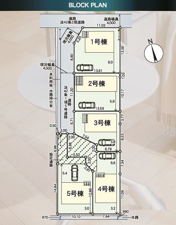 | 備考 | ※全棟位置指定道路・未利用地・水路持分1/5有り ※3~5号棟:協定通路有り(地役権設定)※建ぺい率:1号棟60%→70%(角地緩和) | ||