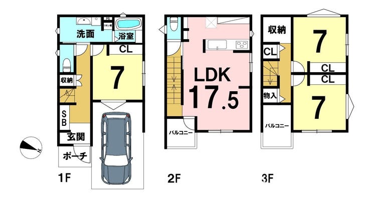 | 備考 | ・造付BL面積:3.12㎡(2階)、4.96㎡(3階) ・建物面積に1階車庫部分5.79平米含む |