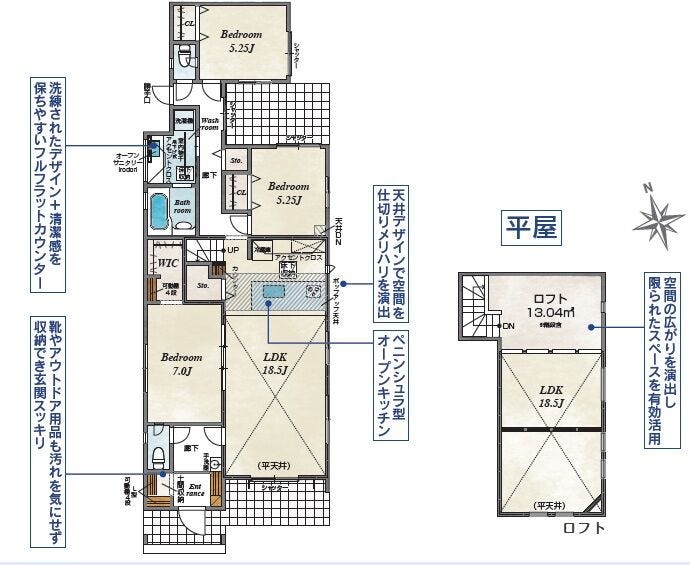 | 備考 | ■陽当たり良好な3LDK平屋住宅 ■階段でつながる約8.4帖のロフト付き ■洗練されたデザインのオープンサニタリー ■玄関がスッキリと片付く土間収納を採用 ■カースペース並列3台駐車可(車種による) |