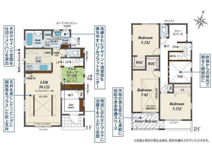 | 備考 | ■LDK広々20帖超、マルチスキップ付き ■マルチスキップ上部吹抜 ■オープンサニタリー ■カースペース2台分駐車可能(車種による) ※隅切り部分①0.49㎡②0.48㎡、各1/2持分有) |