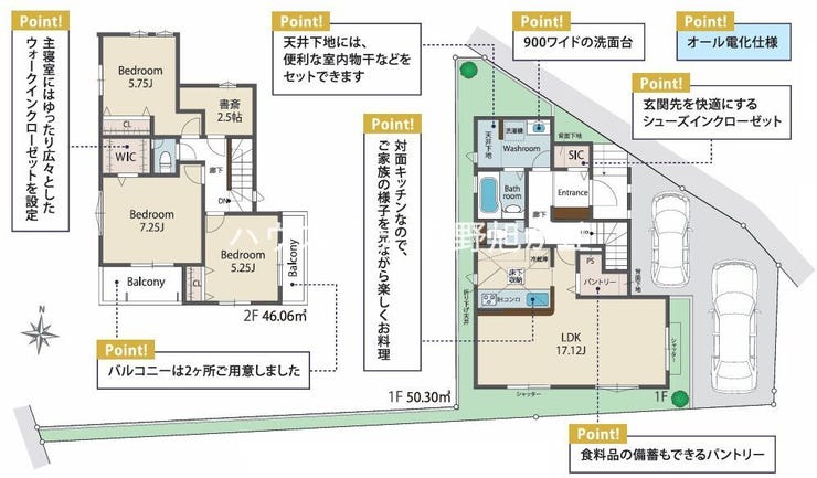17.1帖の広々LDKと2.5帖の書斎が魅力! シューズインクロークやパントリーなど収納も非常に充実しています 。ZEH水準&オール電化で快適な省エネ生活が叶います 。