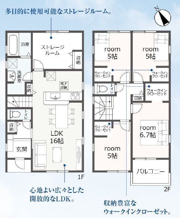 | 備考 | ・心地よい広々とした開放的なLDK ・多目的に使用可能なストレージルーム ・収納豊富なウォークインクローゼット ※私道部分:0.50㎡(共有道路) ※通行地役権を設定して頂きますので別途設定登記費用がかかります。 ※建物、配置、外構は実際とは多少異なる場合があります。 ※図面と現況が異なる場合は現況を優先と致します。 |