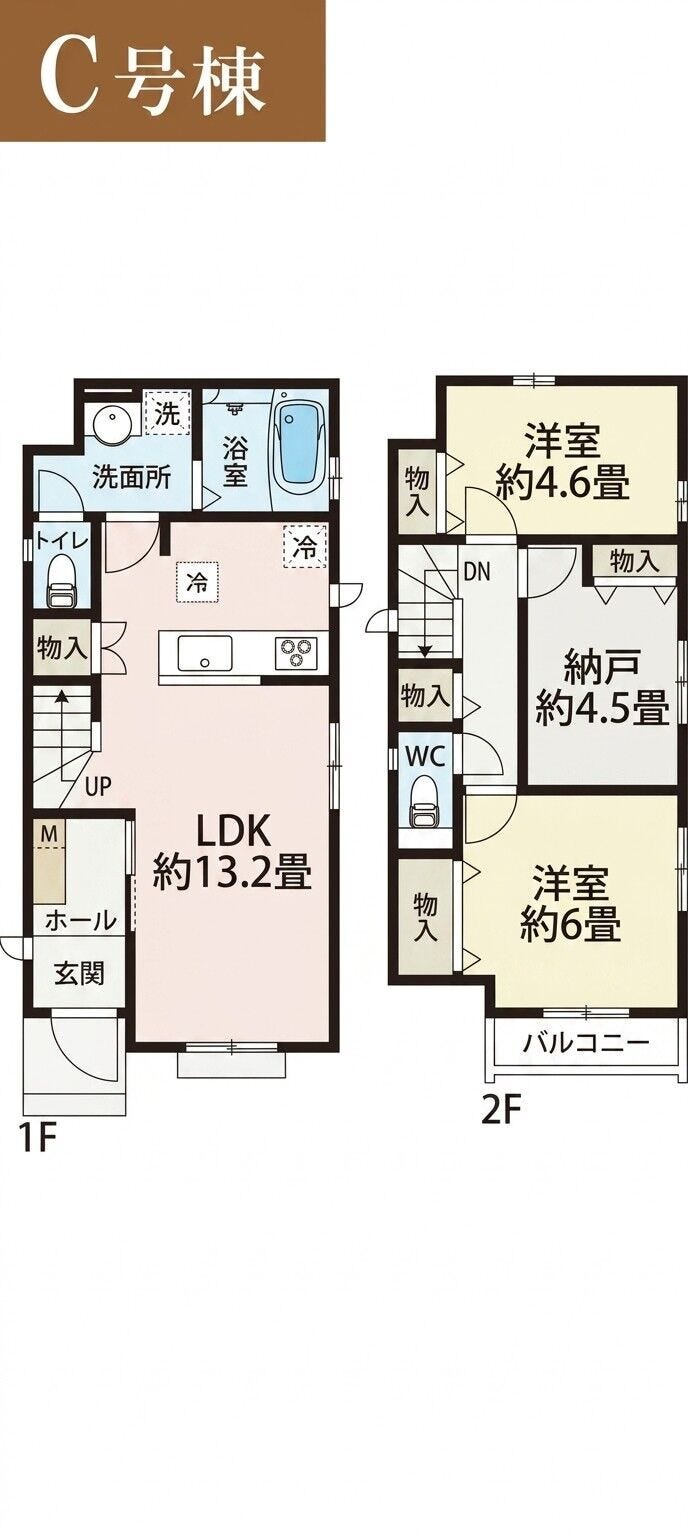 2階には6帖の洋室と4.6帖の洋室に加え、4.5帖の「納戸」を配置しています。