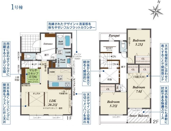 | 備考 | ■LDK広々20帖超え ■マルチに活躍する小上がり空間 ■天井デザインでメリハリを演出 ■天候の急な変化にも対応できるインナーバルコニー ■カースペース2台駐車可(車種による) ※持分あり:ゴミ集積所(4.3㎡の1/6) |