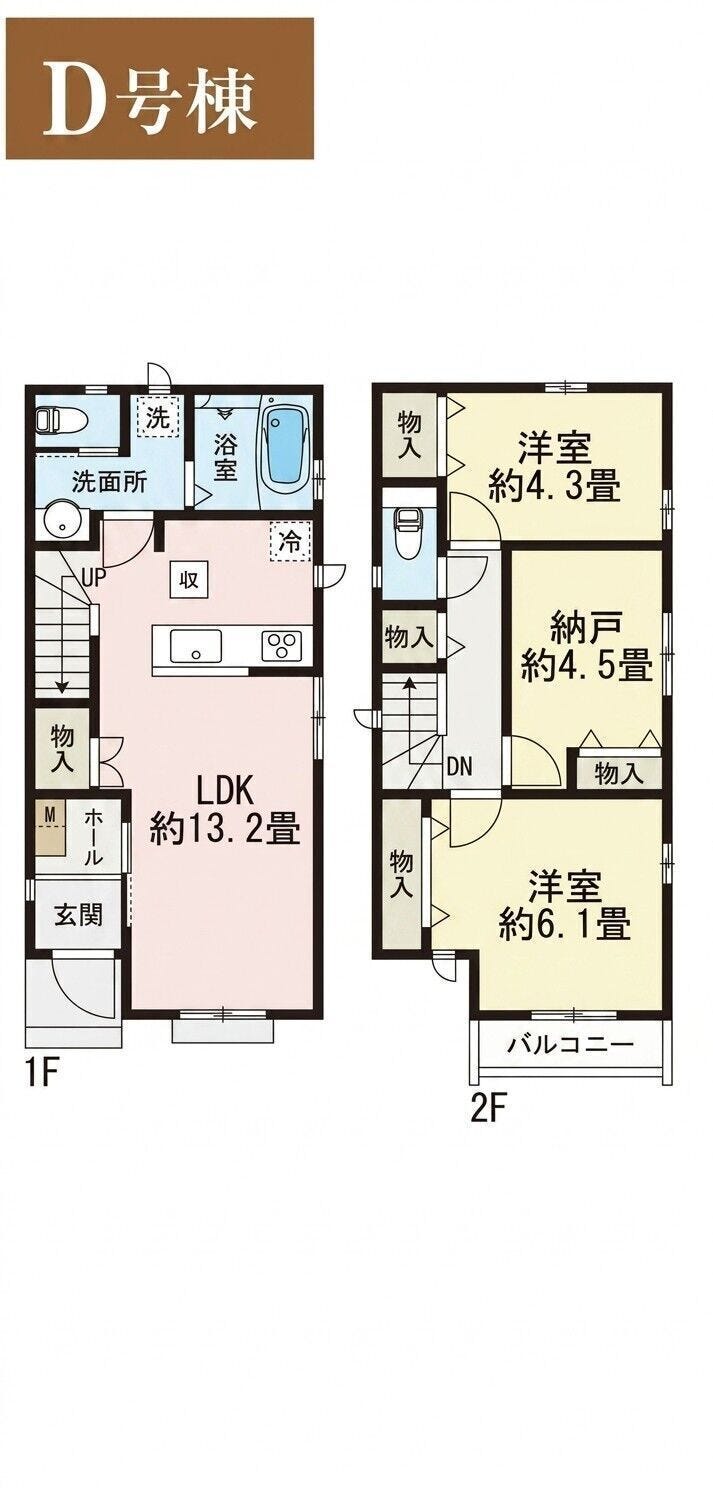 2階には6.1帖と4.3帖の洋室に加え、4.5帖の「納戸」を配置。仕事部屋としても活用可能です。
