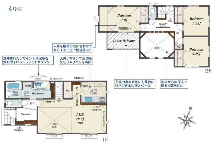 | 備考 | ■広々とした20帖のLDK ■天井デザインでメリハリを演出 ■天候の急な変化にも対応できるインナーバルコニー ■カースペース2台駐車可(車種による) ※持分あり:開発道路(100.47㎡の1/4)、ゴミ集積所(4.3㎡の1/6) |