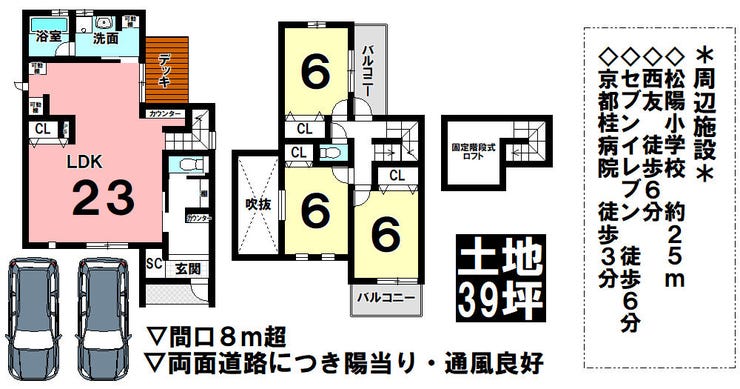 | 小学区 | 松陽小学校 徒歩1分 (約80m) | 中学区 | 桂中学校 徒歩13分 (約1018m) |