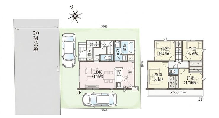 並列で2台停められるカースペースを確保。ご夫婦それぞれが車通勤の場合や、来客時にも困りません。前面道路は6mの公道で、運転に自信がない方でもスムーズに出し入れができます。