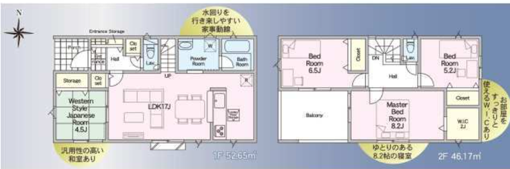 17帖LDKに和室を備えた使い勝手の良い4LDK。8.2帖の主寝室にはWIC付きで収納充実。