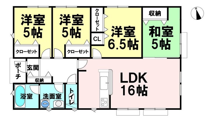LDK16帖に洋室3部屋+和室を備えた平屋4LDK。すべての生活空間がワンフロアにまとまり、家事・生活動線もスムーズ。オール電化仕様の快適住宅。