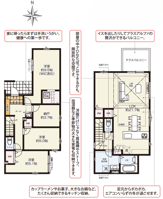 | 備考 | 足立区平野3丁目の新築分譲住宅2号棟。つくばエクスプレス「六町」駅徒歩19分、東武伊勢崎線「西新井」駅徒歩25分の2路線利用可能。LDK約21.7帖のゆとりある空間にテラスバルコニーを備え、開放的な暮らしが実現できます。外にイスやテーブルを置いてくつろげるスペースとしても活用可能です。全居室収納に加え、ウォークインクローゼットやパントリーなど収納豊富。床暖房・食洗機・浴室乾燥機など設備も充実しています。ZEH水準住宅で断熱性・省エネ性能にも配慮。小学校徒歩約1分で通学安心の住環境。※網戸・カーテンレール・TVアンテナ等はオプションとなります。※図面と現況が異なる場合は現況優先となります。 | ||