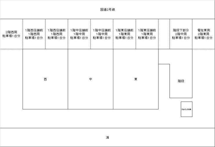 | 備考 | 2号線沿いの海の見える売アパートです♪1F店舗3戸、2F住居3戸 2DK間取り 年間収入:3,528,000円 満室利回り:10.08% 固定資産税:96,851円/年額 2026/1現在満室 ※令和7年の固定資産税評価額 建物3,362,605円 土地11,906,800円 ※2020年7月 外壁屋根塗装済み。 ※境界非明示 現況有姿でのお引渡しとなります。 |