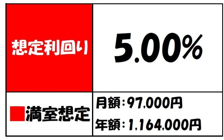| 収益情報 | 表面利回り:5.00% 家賃収入:1,164,000円 |