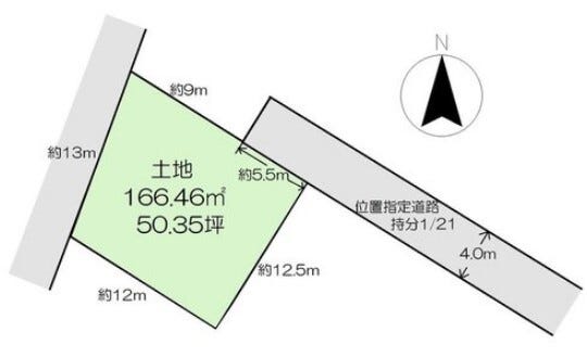 | 土地面積 | 公166.46㎡(50.35坪) | 接道 | 北東側(私道)幅 約4.0m 間口 約5.50m(位置指定) |
