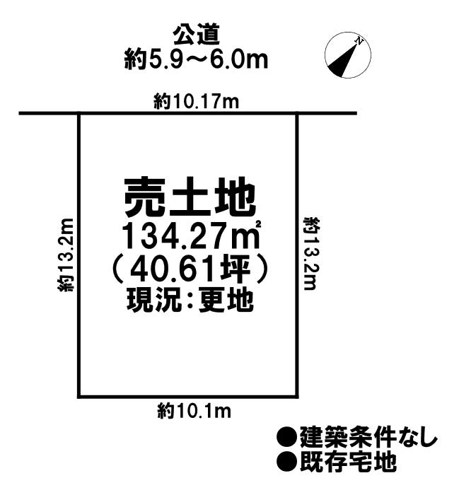 | 土地面積 | 実134.27㎡(40.61坪) | 接道 | 北側(公道)幅 約5.9m 間口 約10.17m |