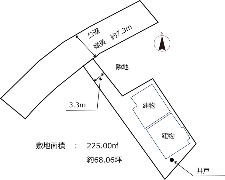 | 土地面積 | 公225㎡(68.06坪) | 接道 | 北西側(公道)幅 約7.3m 間口 約3.30m |