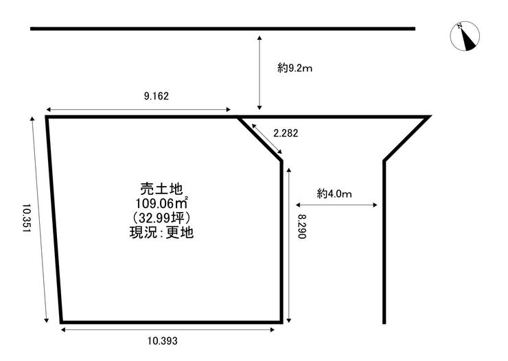 | 土地面積 | 公109.06㎡(32.99坪) | 接道 | 北側(公道)幅 約9.2m 間口 約9.16m 東側(私道)幅 約4.0m 間口 約11.11m |