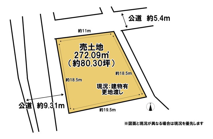 | 土地面積 | 272.09㎡(82.30坪) | 接道 | 西側(公道)幅 約9.3m 間口 約18.50m 北側(公道)幅 約5.4m 間口 約11.00m |