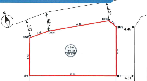 | 土地面積 | 実227.47㎡(68.80坪) | 接道 | 南東側(公道)幅 約4.4m |
