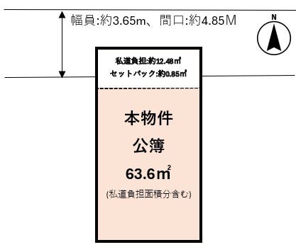 | 土地面積 | 公63.6㎡(19.23坪) | 接道 | 北側(私道)幅 約3.6m 間口 約4.85m |