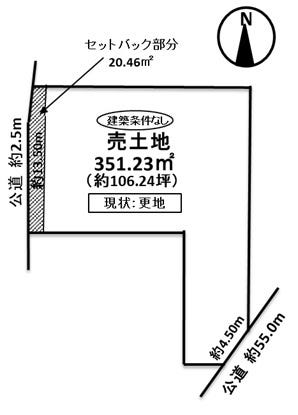 | 土地面積 | 351.23㎡(106.24坪) | 接道 | 西側(公道)幅 約2.5m 間口 約13.50m 南側(公道)幅 約55.0m 間口 約4.50m |