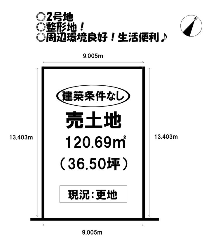| 土地面積 | 実120.69㎡(36.50坪) | 接道 | 南東側(私道)幅 約4.0m 間口 約9.00m |