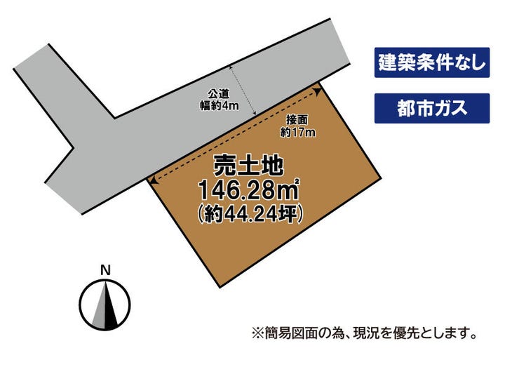 | 土地面積 | 公146.28㎡(44.24坪) | 接道 | 北側(公道)幅 約4.0m 間口 約17.00m |