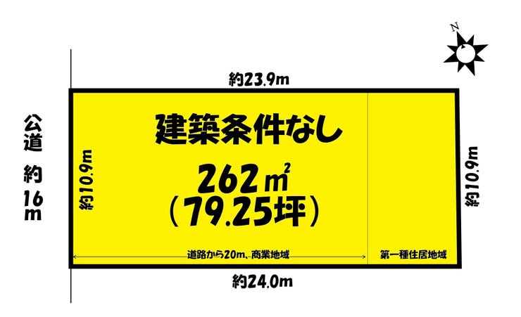 | 土地面積 | 262㎡(79.25坪) | 接道 | 西側(公道)幅 約16.0m 間口 約10.90m |