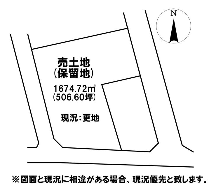 | 土地面積 | 実1674.72㎡(506.60坪) | 接道 | 北東側(公道)幅 約12.0m 南側(公道)幅 約6.0m |