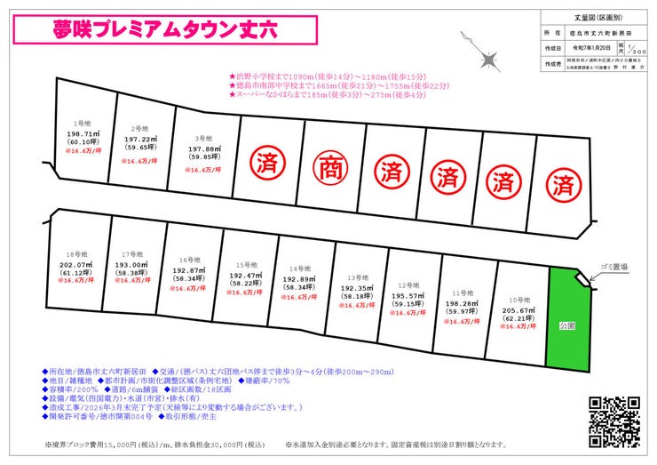 | 備考 | ◆開発許可番号/徳市開第004号 ◆設備/電気(四国電力)・水道(市営)・排水(有) ◆造成工事/2026年3月末完了予定(天候等により変動する場合がございます。) ※境界ブロック費用15,000円(税込)/m、排水負担金30,000円(税込) ※水道加入金別途必要となります。固定資産税は別途日割り額となります。 |